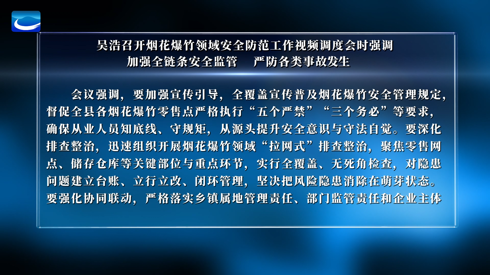 吴浩召开烟花爆竹领域安全防范工作视频调度会时强调 加强全链条安全监管 严防各类事故发生